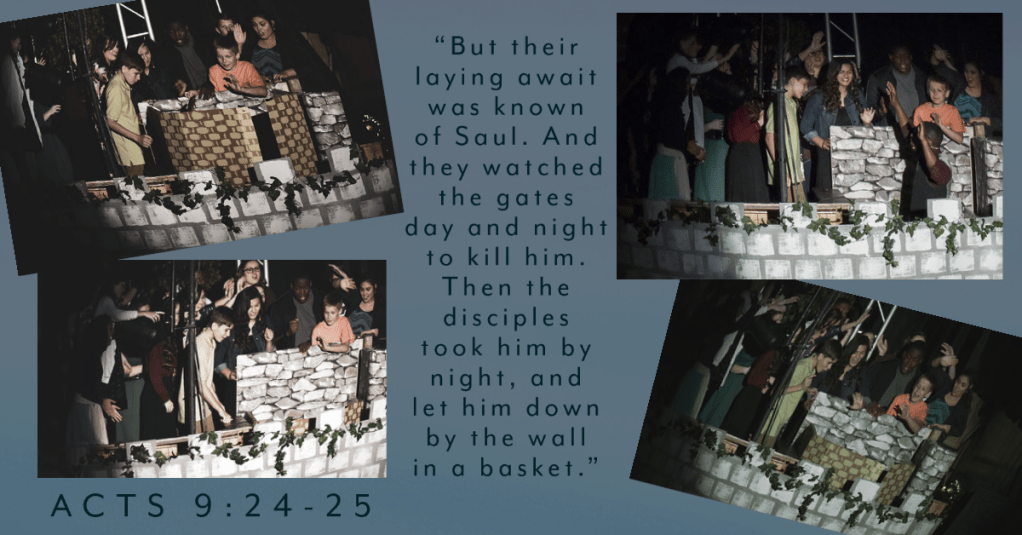 I think one of our favorite and most exciting parts of Acts, a City Rising was the night that Paul escaped. His life was being threatened, and at nightfall, his followers helped him sneak out of town, fleeing to the wall as they lowered him down over the city wall in a large basket. I think we all felt goosebumps every single time we did that scene.